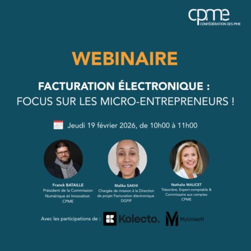 Webinaire CPME le 19 février (10h–11h) : comprendre la facturation électronique et ses impacts pour les micro-entrepreneurs. Inscription obligatoire.