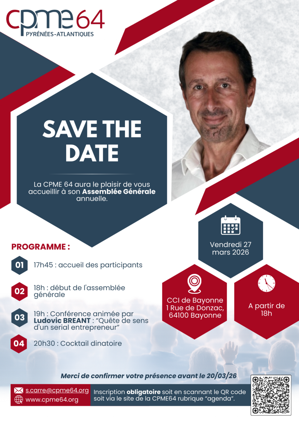 Inscription obligatoire en scannant le QRCode ci-dessous ou en cliquant sur Assemblée Générale CPME64 et Conférence « Quête de sens d’un serial entrepreneur »